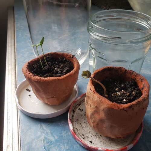 In the workshop we will 1. make pinch pots with drainage holes at the bottom that will fit into the upturned jar, using the lid as a tray, 2. put YukonGrow seedling mix into our ziplocks and label them, 3. paste up seed envelopes and label them.